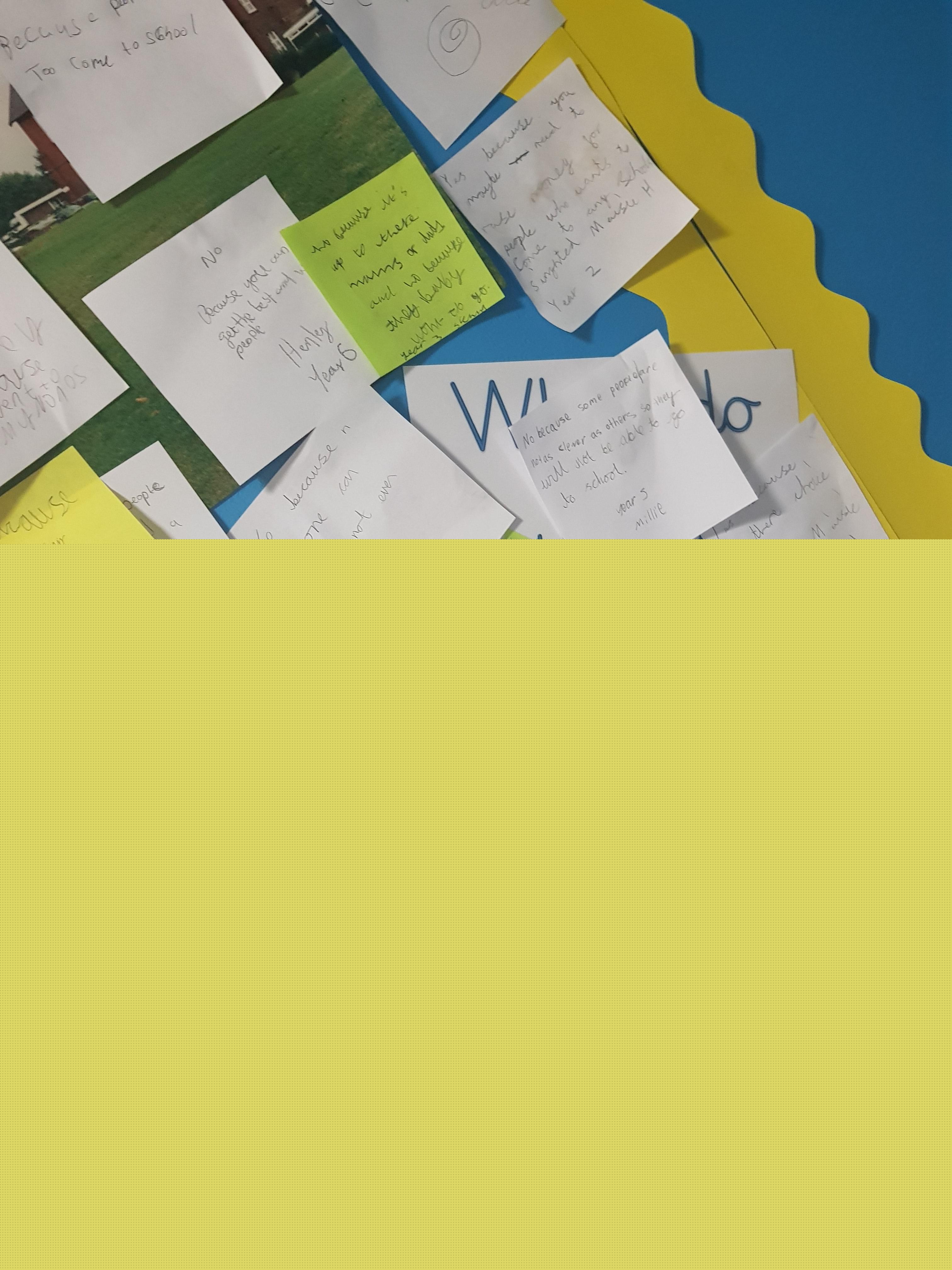 The teachers then discuss the question in class and it is adapted to suit each Key Stage and year group. In  achievement assembly the children are again asked the question and they give examples of what they have spoken about and if their opinion has changed/stayed the same and why.