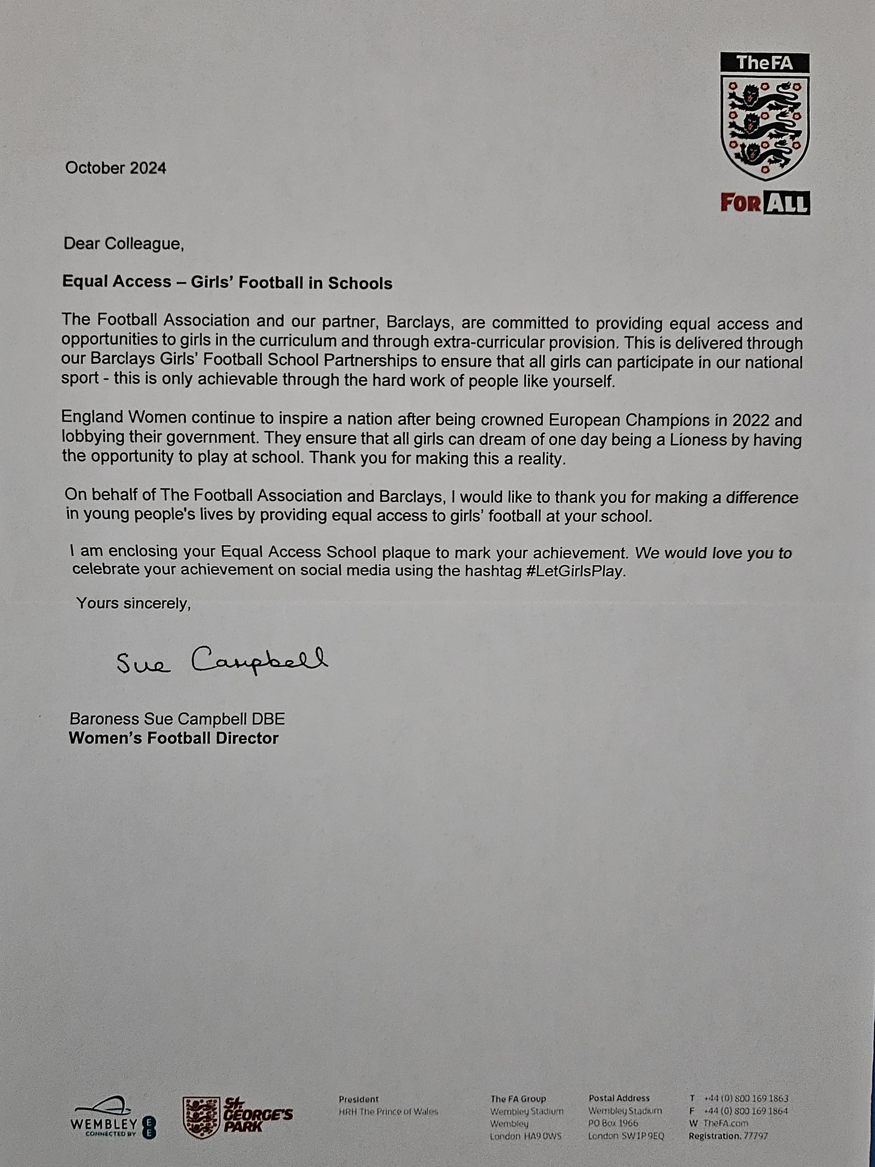 Recently, we received an 'Equal Access - Girl's Football in Schools' award from The Football Association (in partnership with Barclays.) This is an award that only a small number of schools in Cumbria have achieved this year.